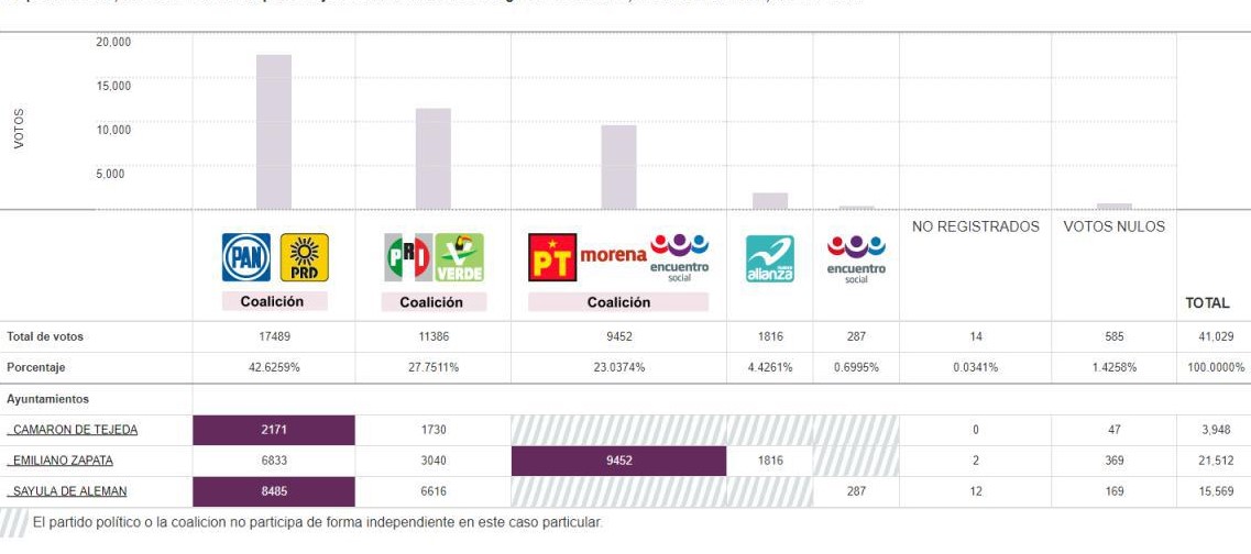 Datos preliminares confirmaba el triunfo de la coalición Veracruz al frente, integrada por PAN-PRD, en los municipios de Camarón de Tejeda y Sayula de Alemán, con Susana Ameca Parisi y Fredy Ayala, respectivamente, y la coalición Juntos haremos historia -Morena-PT-PES- en Emiliano Zapata con Jorge Mier Acolt.