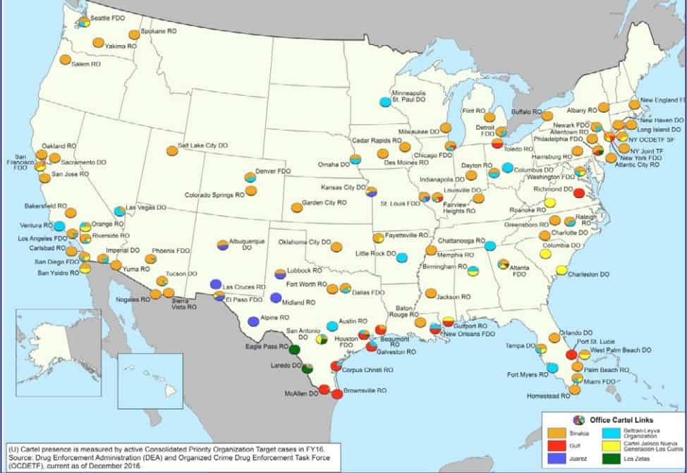 De acuerdo con la DEA, el Cártel de Sinaloa tiene presencia en prácticamente todo Estados Unidos, ingresando la droga del lado del pacifico, desde Arizona y California en la frontera con Estados Unidos.