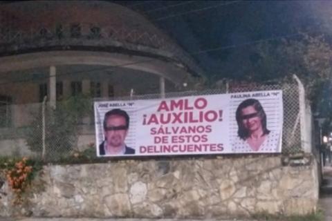 Las lonas con la leyenda “AMLO ¡Auxilio! Sálvanos de estos delincuentes”, hacen referencia al empresario y dueño del periódico El Buen Tono, José Abella, y Paulina Abella, funcionaria municipal.