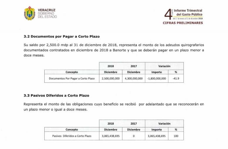 En la página 86 del Cuarto Informe Trimestral se detallan los nuevos pasivos de la administración de García Jiménez. Si bien el monto es menor al crédito contratado por Yunes, quien pidió préstamos quirografarios por 4 mil 300 millones de pesos, a lo contratado con Banorte se le suma el adelanto de participaciones por 3 mil 65 millones de pesos.