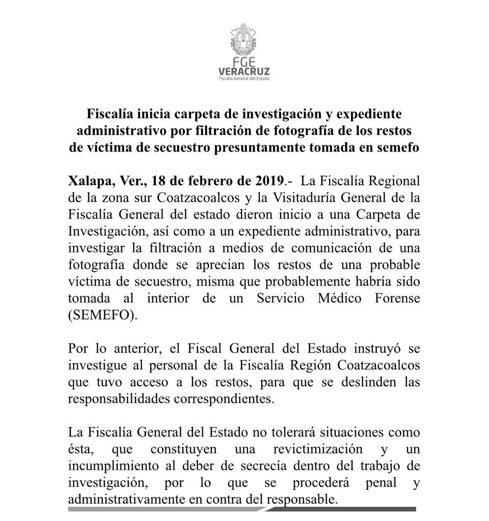 “La Fiscalía Regional de la Zona Sur Coatzacoalcos y la Visitaduría General de la Fiscalía General del estado dieron inicio a una carpeta de investigación para investigar la filtración a medios de comunicación de una fotografía donde se aprecian los restos de una probable víctima de secuestro, misma que probablemente habría sido tomada al interior de un Servicio Médico Forense (Semefo)”, informa el comunicado.
