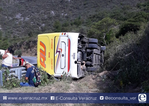 Acultzingo, Ver.- Alrededor de las 16:30 horas de este lunes 5 de agosto, se registró la volcadura de un autobús de la línea AU con No Económico 3963 que cubría la ruta Tehuacán - Puebla, saliendo de la carretera.