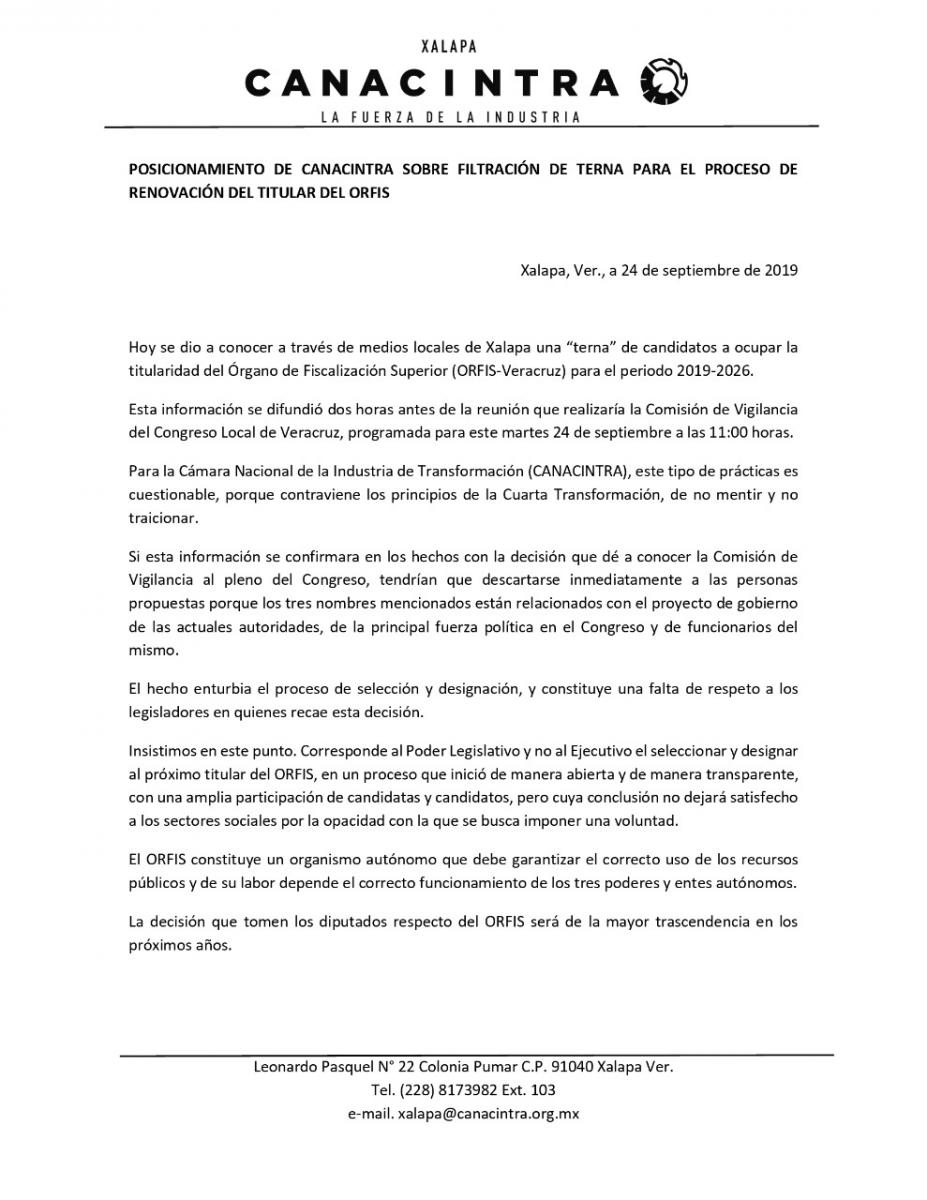 Xalapa, Ver.- La CANACINTRA Xalapa se pronunció en contra de que la terna para elegir al nuevo titular del Órgano de Fiscalización Superior del Estado (ORFIS) se haya filtrado en algunos medios antes de que la Comisión de Vigilancia del Congreso del Estado se reuniera para anunciarla formalmente.