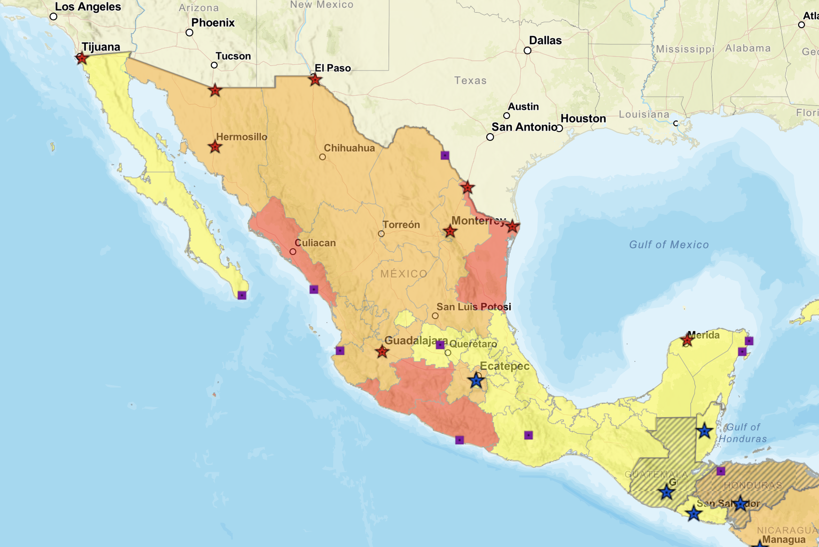 En el mismo mapa estados como Colima, Guerrero, Sinaloa, Michoacán y Tamaulipas aparecen en Alerta Roja, por lo que son consideradas entidades peligrosas para visitar.