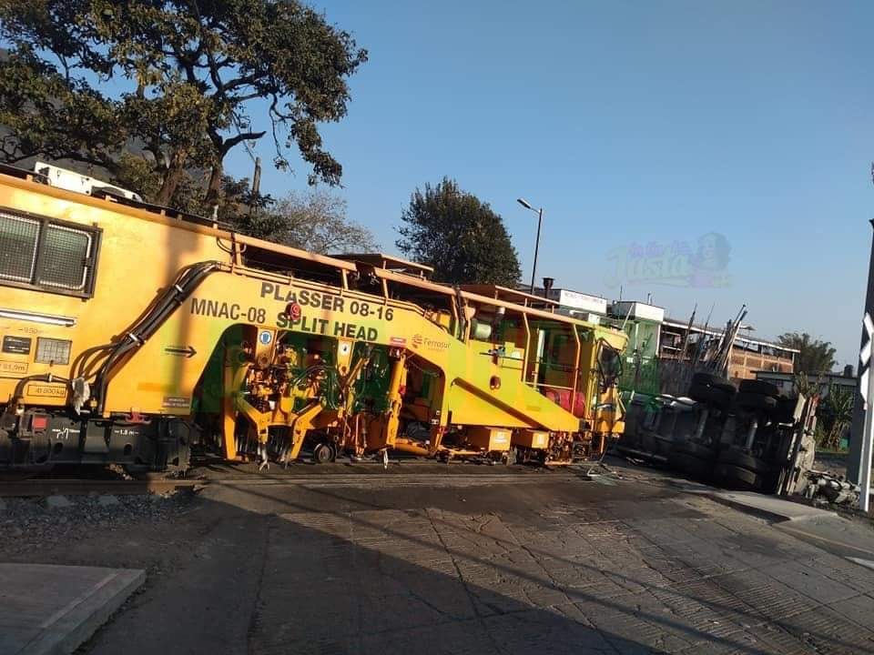 Al intentar ganar paso al tren, pipa con sosa cáustica vuelca en Orizaba