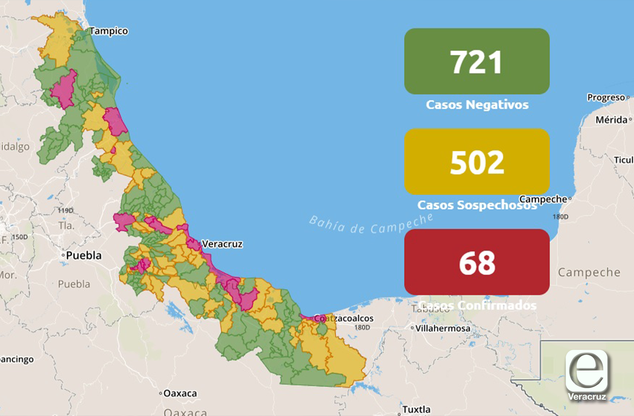 El reporte de la Secretaría de Salud ubica la mayoría de los casos en la zona conurbada Veracruz-Boca del Río, que suma más de la mitad del total de casos diagnosticados de covid-19, con 37 de los 68.
