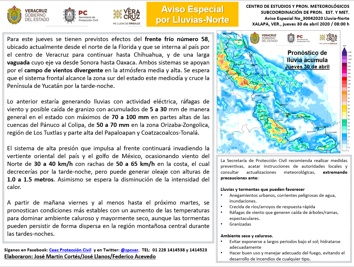 Xalapa, Ver.- Este jueves, el departamento de Meteorología de Protección Civil Estatal emitió un aviso especia por los efectos que Frente Frío #58 pudiera traer a Veracruz, mismos que arribarán durante el medio día y la tarde de hoy.