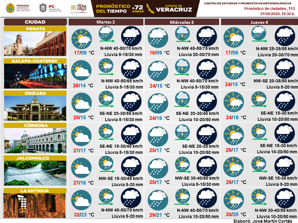 Continuará el viento del Norte y Noroeste que presentaría velocidades de 35 a 50 km/h con rachas eventuales de 60 a 80 km/h en la costa centro-sur, de 50 a 75 km/h en la zona montañosa entre Xalapa-Misantla y de 40 a 65 km/h en la costa norte, siendo posible rachas superiores en función de la intensificación. Adicionalmente el oleaje podría desarrollar alturas de 1.0 a 2.5 metros en las proximidades de las costas.