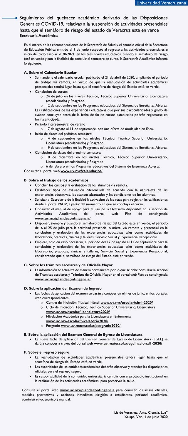 Además, se subraya que la reanudación de actividades académicas ocurrirá hasta que el semáforo de riesgo del Estado esté en verde, de ahí que se especifican medidas para el calendario escolar, para el trabajo de académicos, trámites, aplicación de examen de ingreso, y sobre el regreso seguro.