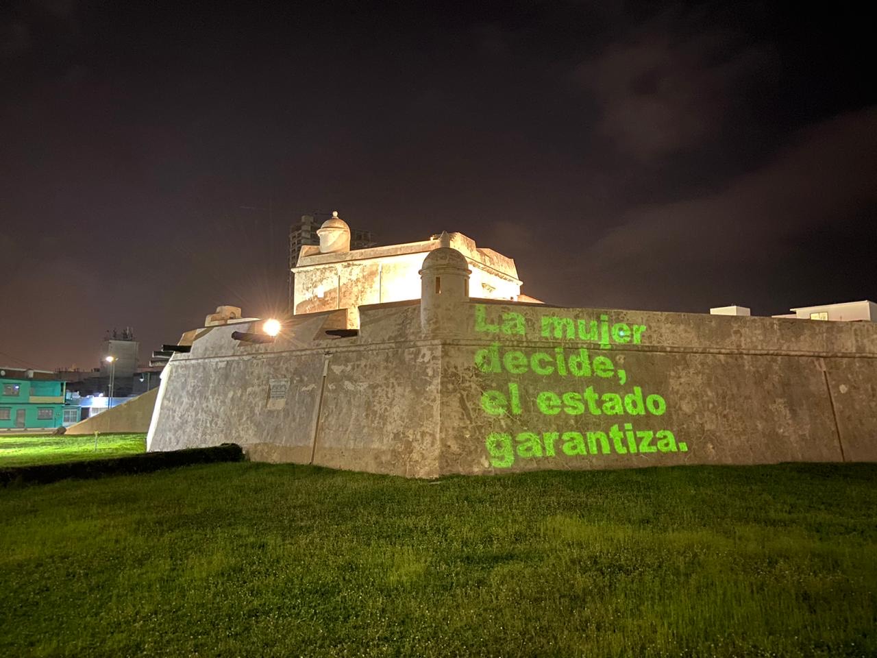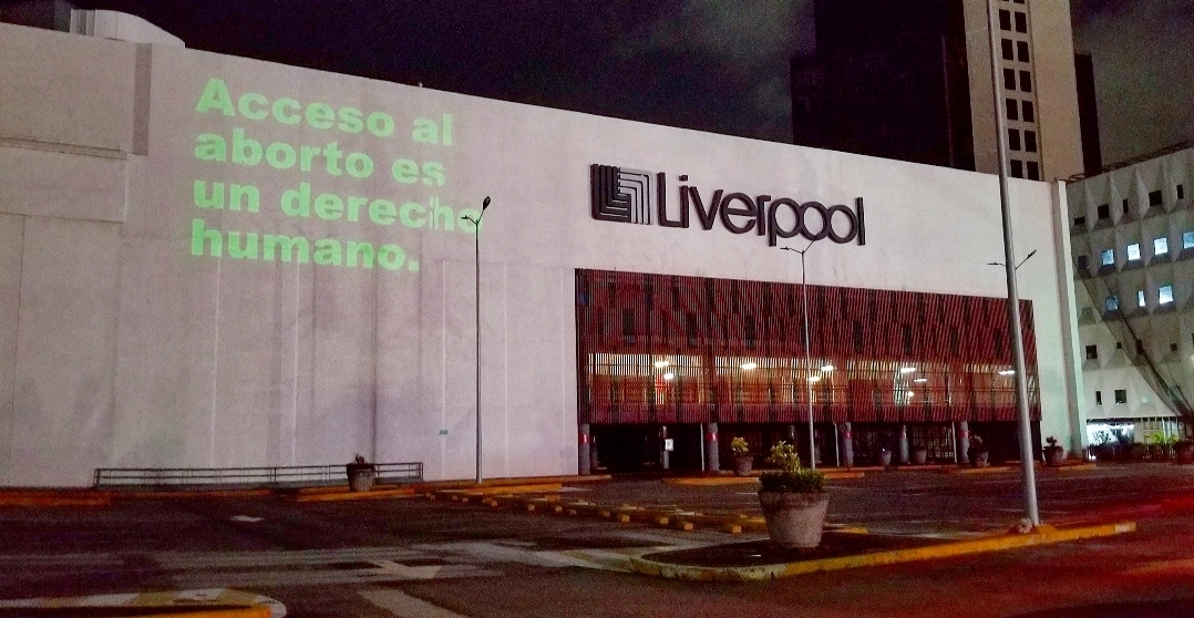 "Mi cuerpo, mi decisión" y "Aborto legal, ya", fueron algunas de las frase que, con letras verdes, fueron puestas en las paredes utilizando un proyector audiovisual.
