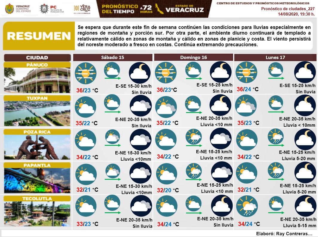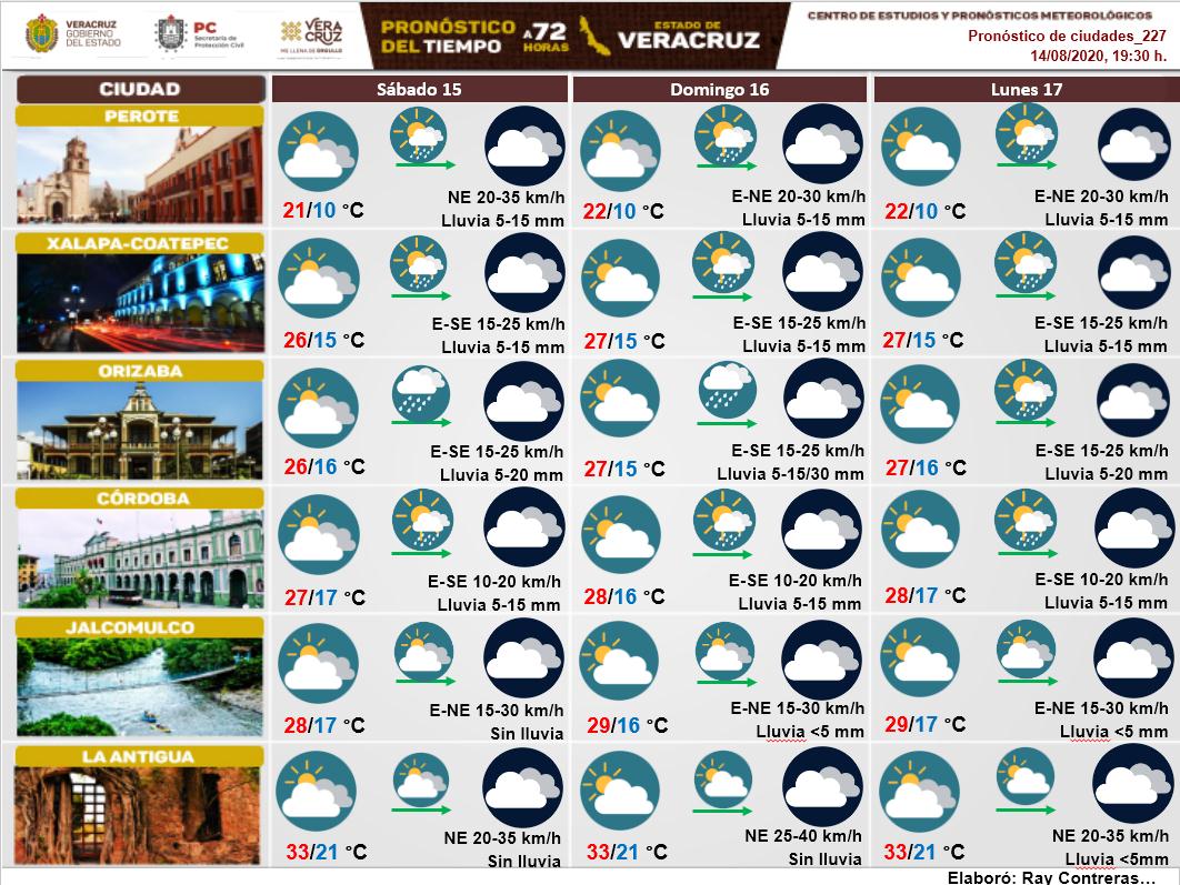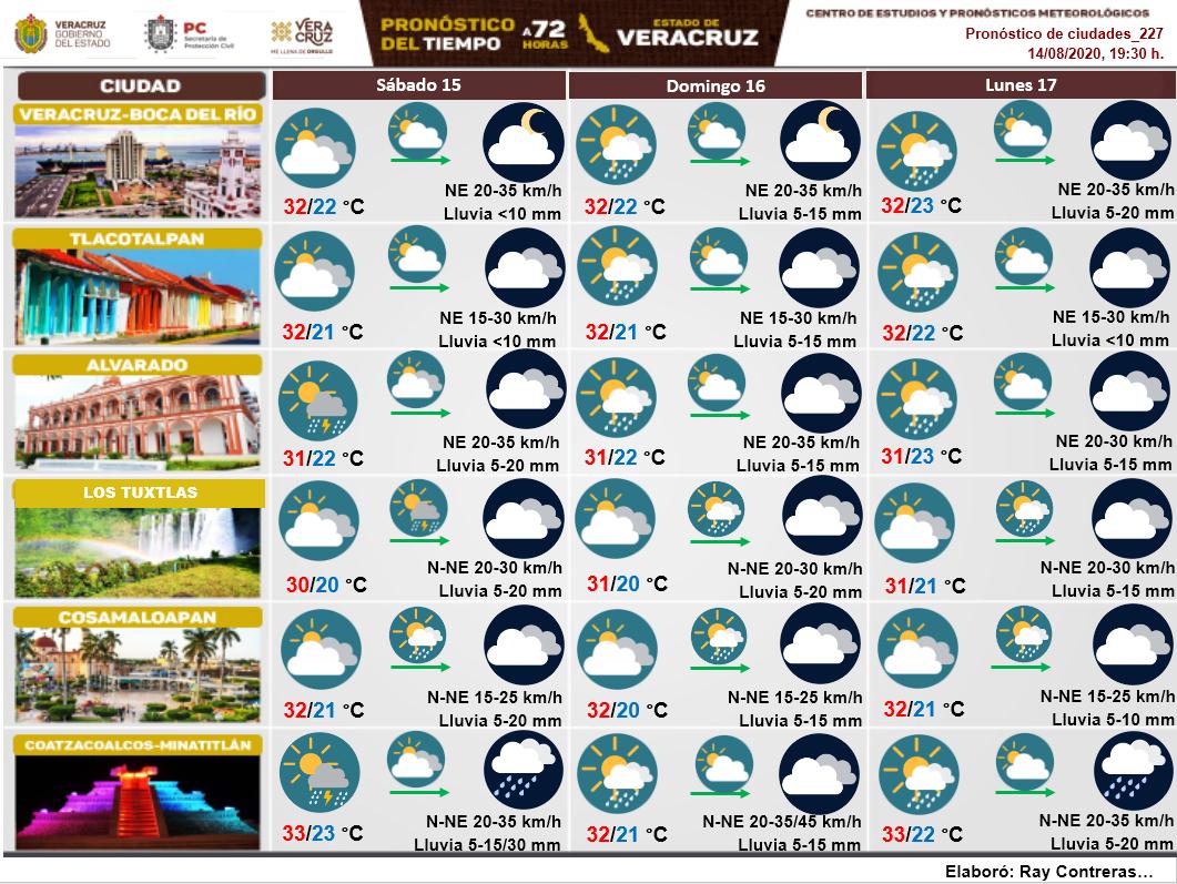 Este sábado se espera un ambiente diurno cálido en áreas de costa y llanura. Por la tarde existe una probabilidad para lluvias y tormentas, especialmente en zona de montaña, donde persiste la probabilidad de que este domingo avance la nueva Onda Tropical número 28.