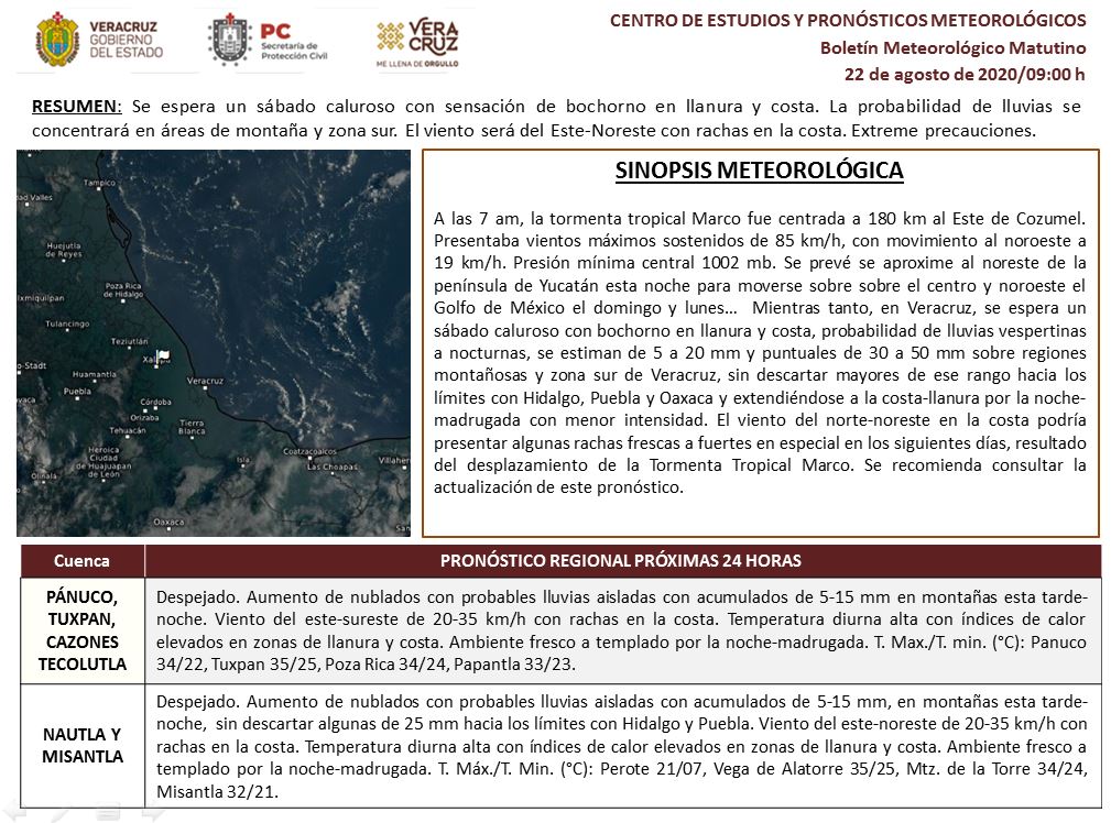 Xalapa, Ver.- Protección Civil Estatal emitió un Aviso Especial tras conocer el pronóstico del tiempo para las próximas horas en Veracruz: tormentas (actividad eléctrica, ráfagas de viento y probable caída de granizo) y lluvias localmente fuertes, así como viento del norte que llegará con rachas fuertes en las siguientes 48 a 96 horas.