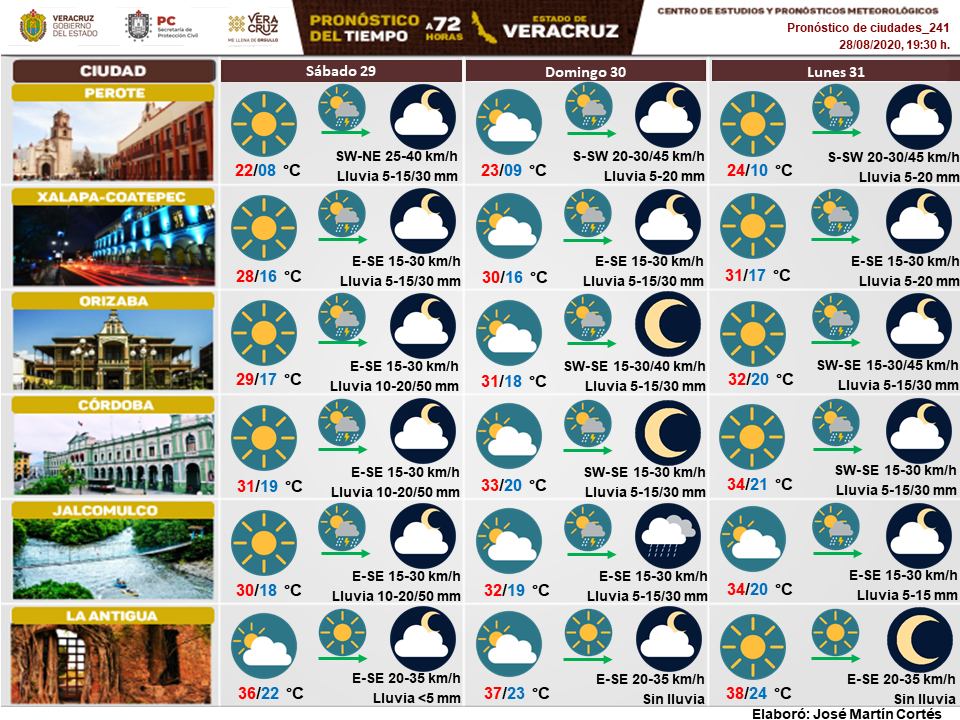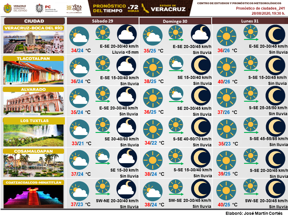 Dominio de viento del Este, Sureste y Sur en gran parte del estado y la persistencia del evento de Surada en la zona sur donde se podrían registrar por intervalos rachas de 60 a 75 km/h en las regiones de Los Tuxtlas y entre Jesús Carranza-Acayucan entre este sábado al lunes 31 de agosto. Tal situación, favorecerá ambiente caluroso a muy caluroso al mediodía-tarde.