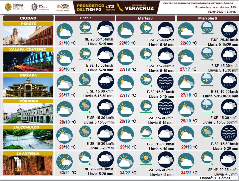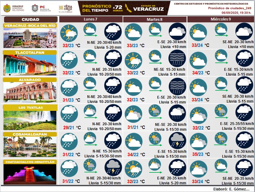 - Viento: Del Norte y Noreste con velocidades de 20 a 35 km/h con rachas eventuales de 45 km/h en la costa, cambiando al Este mañana. La fuerza del viento puede desarrollar oleaje con alturas de 0.5 a 1.0 metros en las proximidades de la costa.