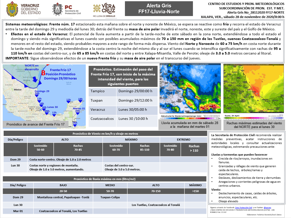 -Viento del Norte y Noroeste de 60 a 75 km/h en costa norte durante la tarde-noche del domingo 29, extendiéndose a la costa centro la noche del mismo día y al sur el lunes cuando se intensifica significativamente con rachas de 95 a 110 km/h en costas del centro-sur, y de 65 a 85 km/h en costas del norte y entre Xalapa-Misantla, Valle de Perote; oleaje de 3.0 a 5.0 metros cercano al litoral.