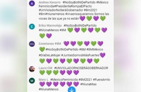 Las mujeres inundan la mañanera que se transmite en YouTube y Facebook con hashtags como #NiUnAgresorEnElPoder, #UnVioladorNoSeraGobernador y #NoSoyUnBotDelPartido. En sus mensajes, pueden verse consignas del movimiento feminista acompañadas de corazones morados y verdes.