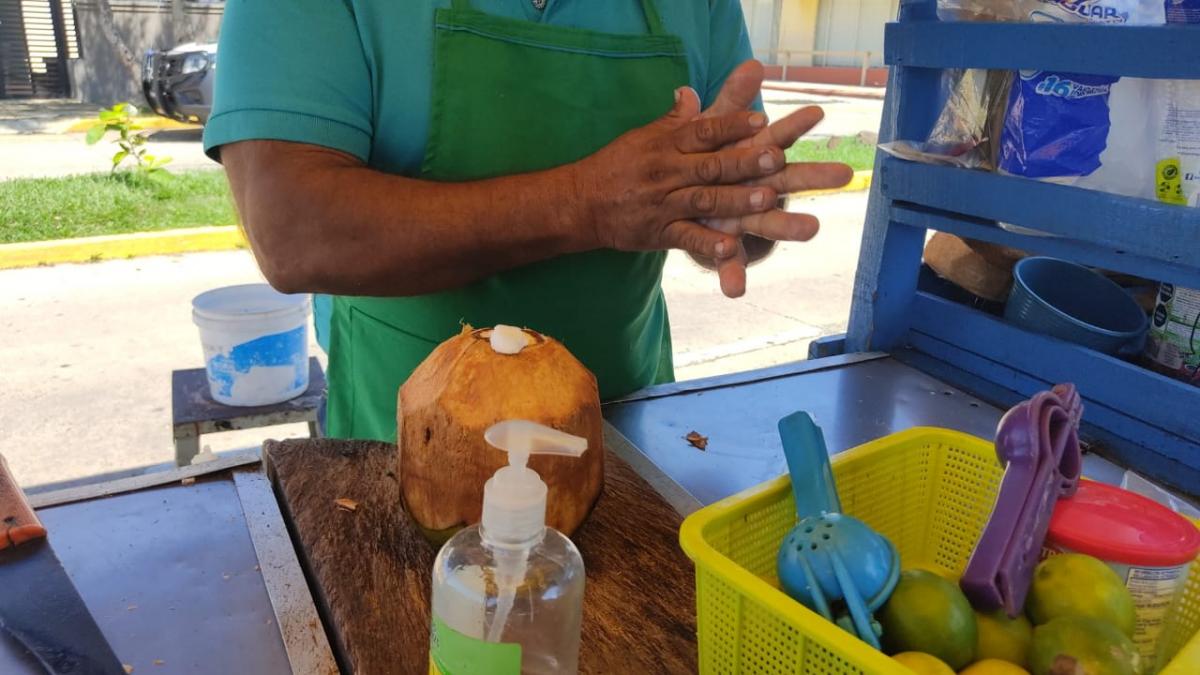 Por cada coco que saca o prepara, se coloca gel antibacterial o se lava las manos; para sus clientes colocó un dispensador de este líquido y si no portar cubrebocas no les vende.