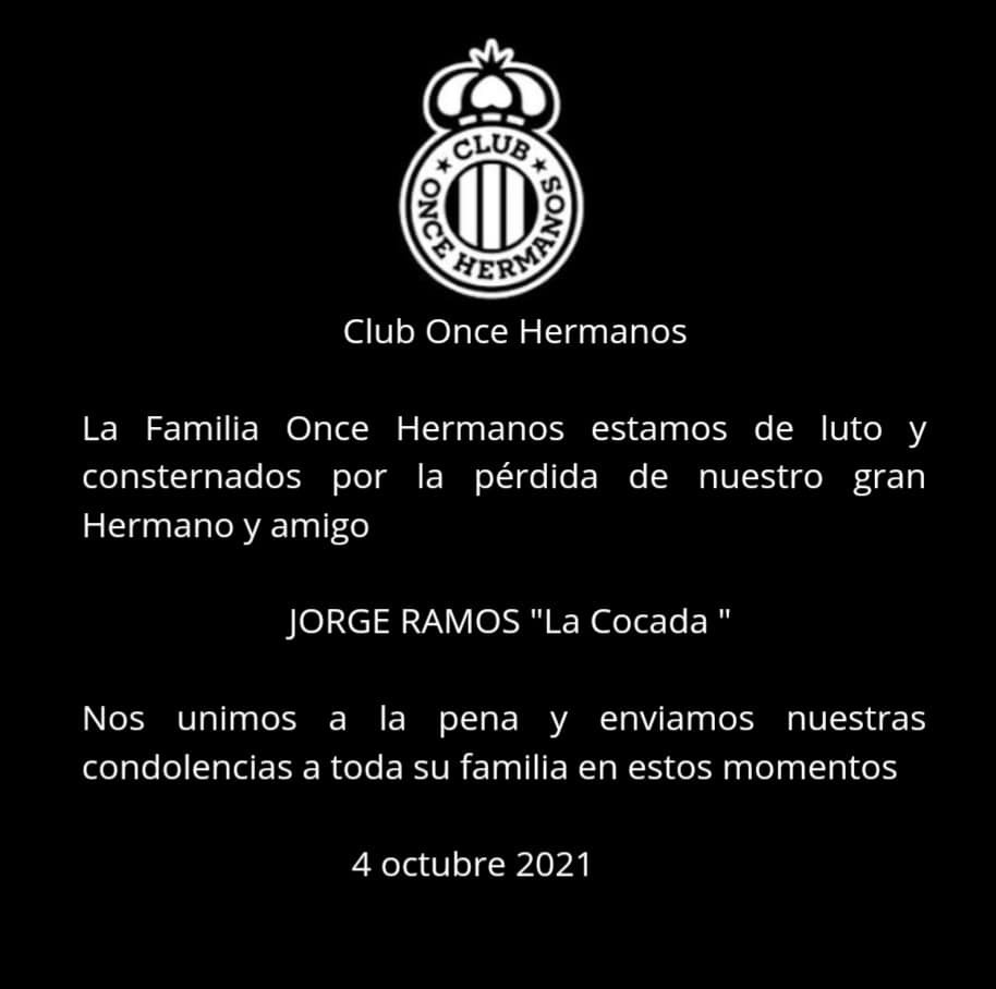 El primer equipo de fútbol al que perteneció “Club Once hermanos”, mandó sus condolencias a través de su cuenta oficial: “El Fútbol está de Luto.