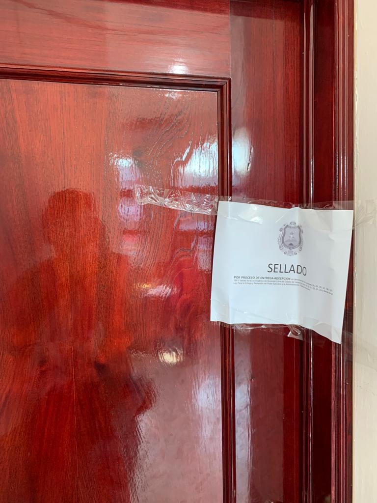 Dichos videos muestran la marca de sellado en la entrada principal de la sala de Presidencia con mensajes alusivos al proceso de entrega recepción.