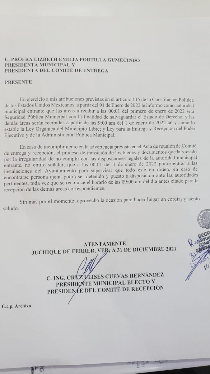 De acuerdo con un documento firmado por el propio Cruz Cuevas, su gobierno asumió el mando de las instalaciones municipales a partir del uno de enero de 2022 a la una de la madrugada, particularmente de la comandancia municipal. En dicho escrito el edil advirtió que ninguna persona ajena a su grupo de colaboradores debía entrar al palacio o sería detenido.