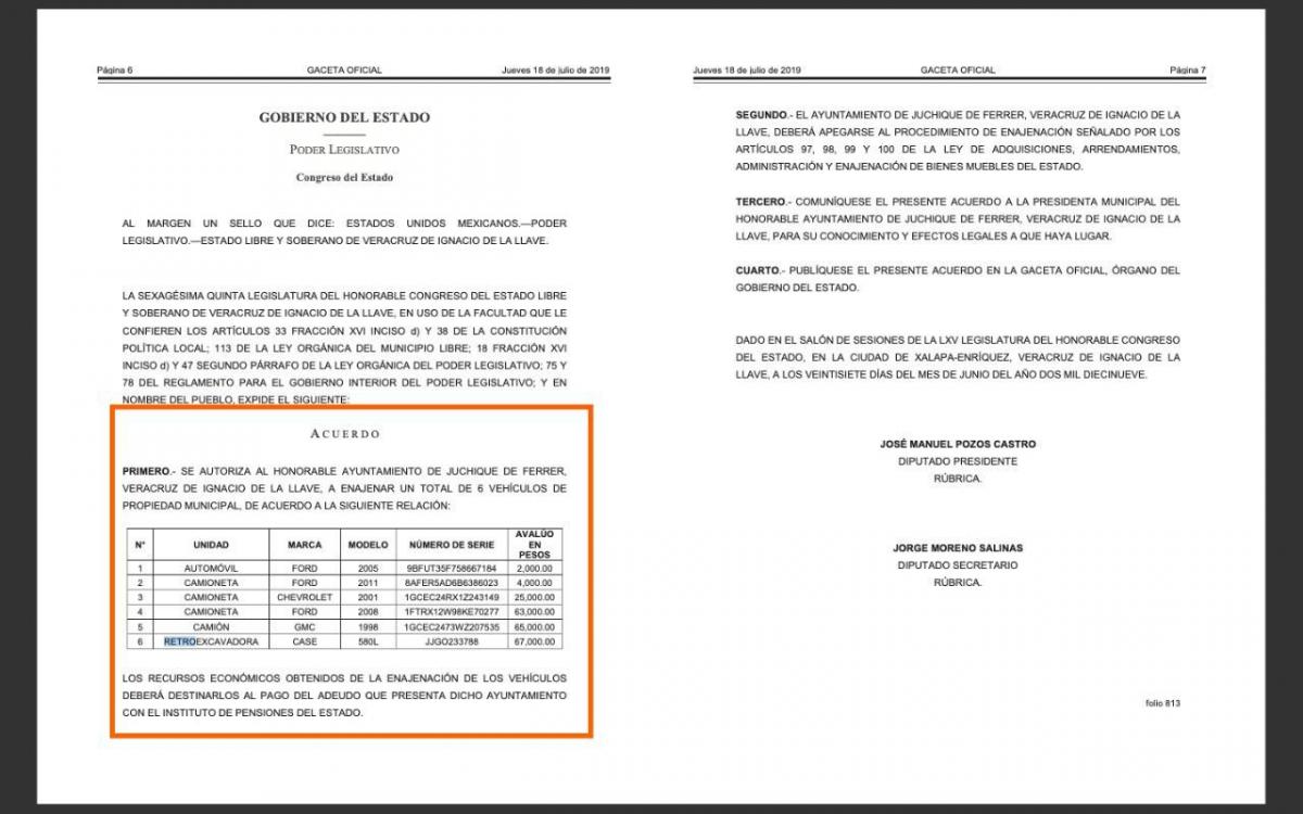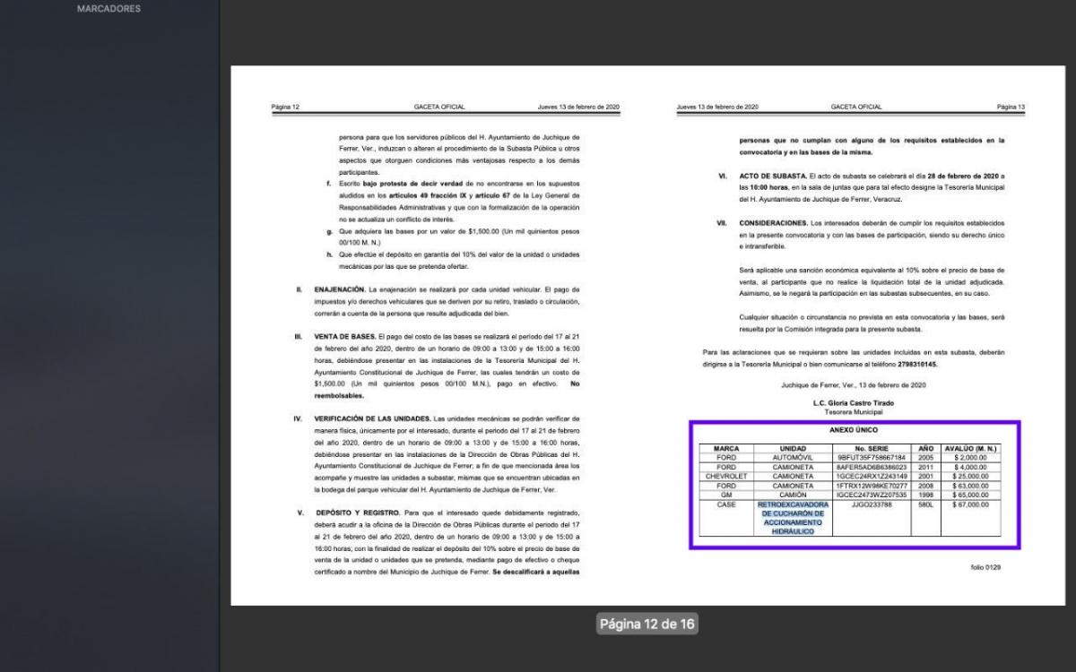 No obstante, los vehículos a los que hizo referencia el edil en realidad fueron subastados el 13 de febrero de 2020, según consta la subasta pública número MJF/TES/12/2019 relativa a la enajenación onerosa de 4 unidades vehiculares y 2 unidades de maquinaria pesada. Lo anterior, autorizado por el Congreso de Veracruz el 18 de julio de 2019.