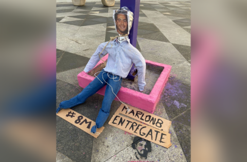 Quienes abandonaron la figura, también dejaron un par de cartulinas con las consignas "Marlon Entrégate" y #8M, por el Día Internacional de la Mujer.