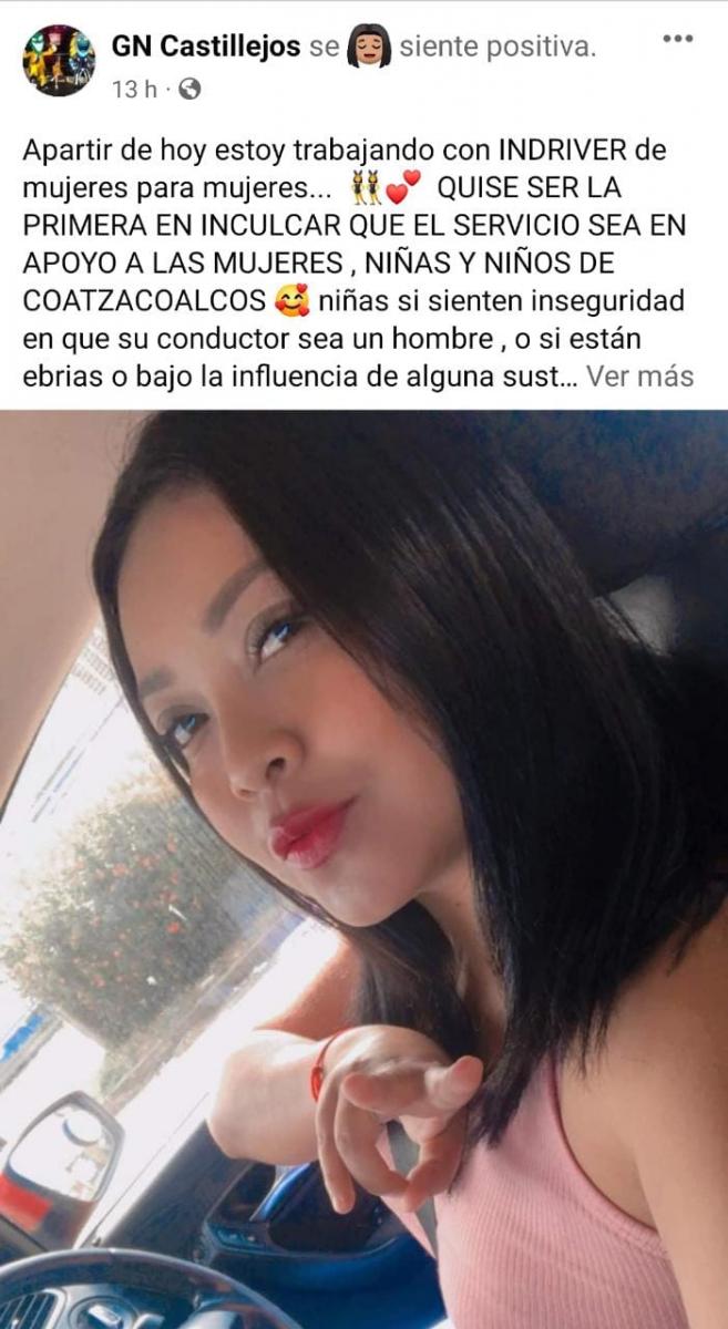 “A partir de hoy estoy trabajando con InDriver de mujeres para mujeres, quise ser la primera en inculcar la igualdad de género en Coatzacoalcos, niñas si sienten inseguridad en que su conductor sea un hombre, o si están ebrias o bajo la influencia de alguna sustancia puedan confiar en mi 24/7, mi servicio incluye cerciorarme que entres hasta la puerta del lugar a donde vas”, publicó en su perfil de facebook.