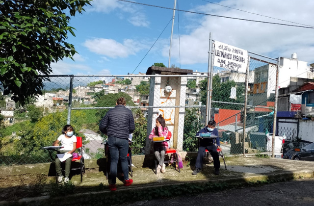 “Las maestras vienen a trabajar, los niños quieren clases, los papás quieren traer a los niños, pero no hay escuela”, dice la directora de la primaria Leonardo Pasquel mientras 30 alumnos y alumnas resuelven la evaluación diagnóstica Mejoredu sobre una de las calles en la colonia Porvenir 2 en Xalapa.