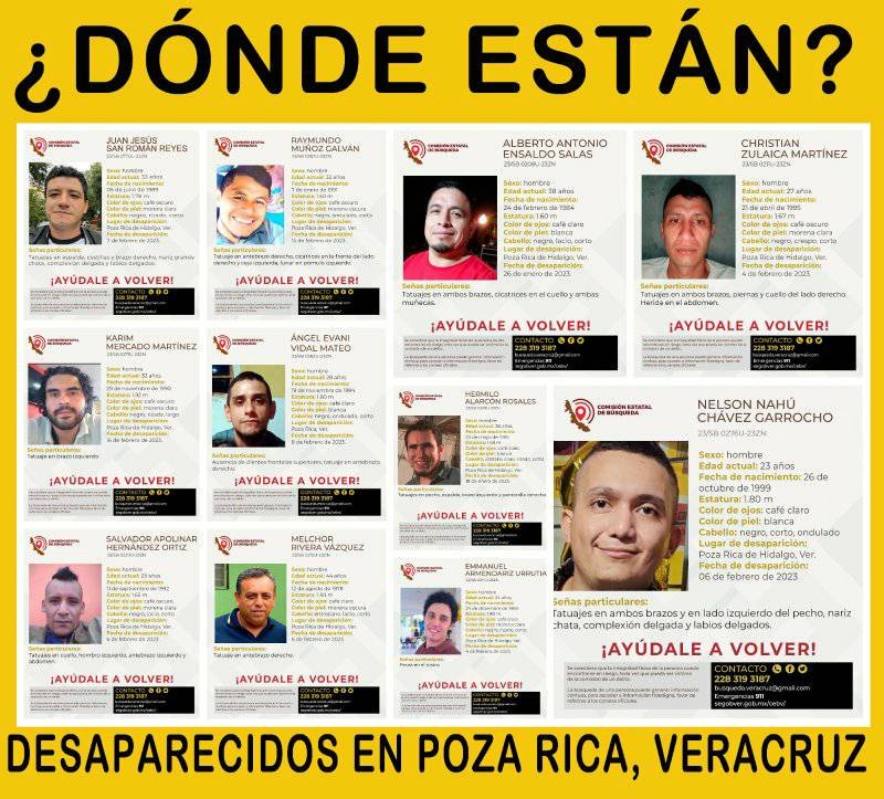 A través de un collage se muestran 11 casos, todos los desaparecidos son hombres entre las edades de 27 a 44 años de edad a quienes les perdieron la pista entre el 18 de enero y 16 de febrero de este 2023. La cantidad de casos en un corto tiempo ha sorprendido a los ciudadanos de esa región petrolera.