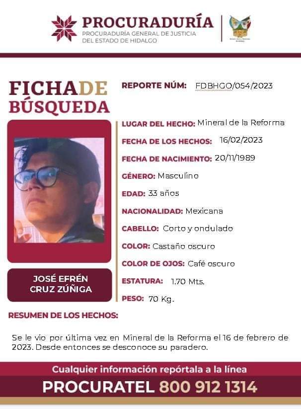 Irandi tiene 26 años de edad y José Efrén 33 años. La Procuraduría General de Justicia del Estado de Hidalgo (PGJEH) emitió las fichas de búsqueda correspondientes. La última vez fueron vistos en el municipio de Mineral de la Reforma, Hidalgo, que fue el momento en que se dirigieron a Veracruz.