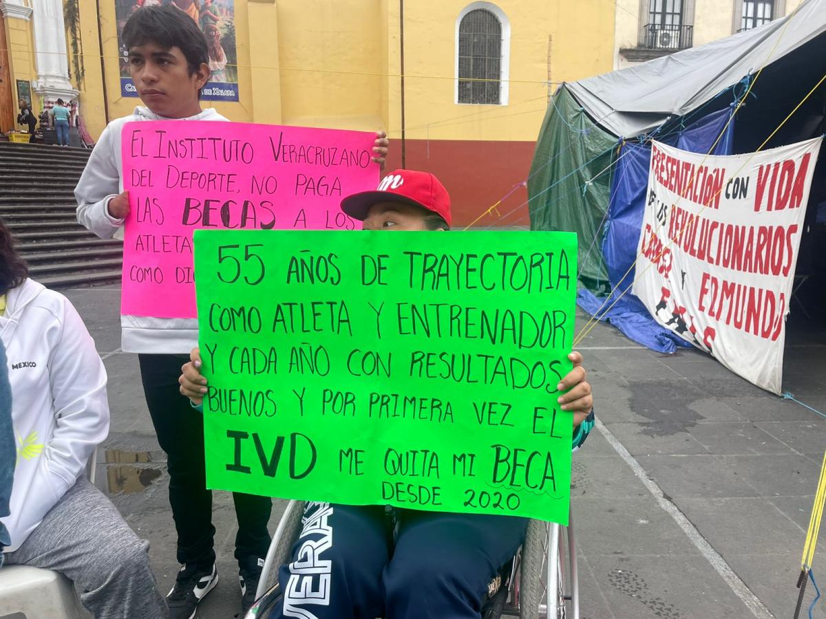 En las pancartas se leían mensajes como “señor Gobernador (Cuitláhuac García Jiménez) ya intervenga en las anomalías que existen en el IVD, tengo tres años dando resultados a Veracruz sin que me paguen mi beca”, “soy entrenador de deporte adaptado con resultados nacionales e internacionales y me quitaron el derecho a la beca”.