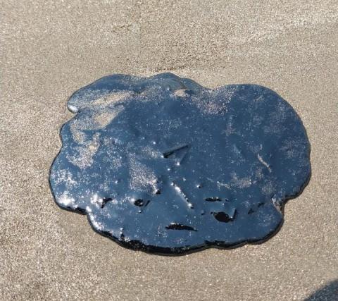 Las manchas negras no se encuentran en toda la playa, sino solo en algunas áreas. El material tiene un olor parecido al del combustible. Son manchas color negro brillante, con una consistencia parecida a la del plástico, pero es pegajosa.