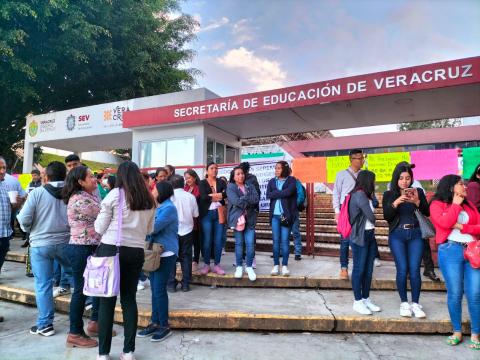 Los profesores, adheridos a la Sección 32 del Sindicato Nacional de Trabajadores de la Educación (SNTE), la mayoría procedentes del norte de la entidad, arribaron aproximadamente a las 05:00 de la mañana a la SEV para iniciar con la protesta y toma de instalaciones.
