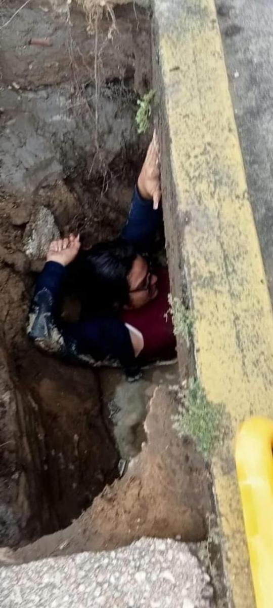 “De regreso la calle estaba totalmente cerrada, al pisar pues me fui y se deslavó totalmente la calle, lo que no entiendo es si había fuga de drenaje o qué porque donde yo caí el agua me llegaba al pecho y caí como sentada, y me iba literal debajo de la carretera y pasaban los carros y se deslavaba todo”, recordó.