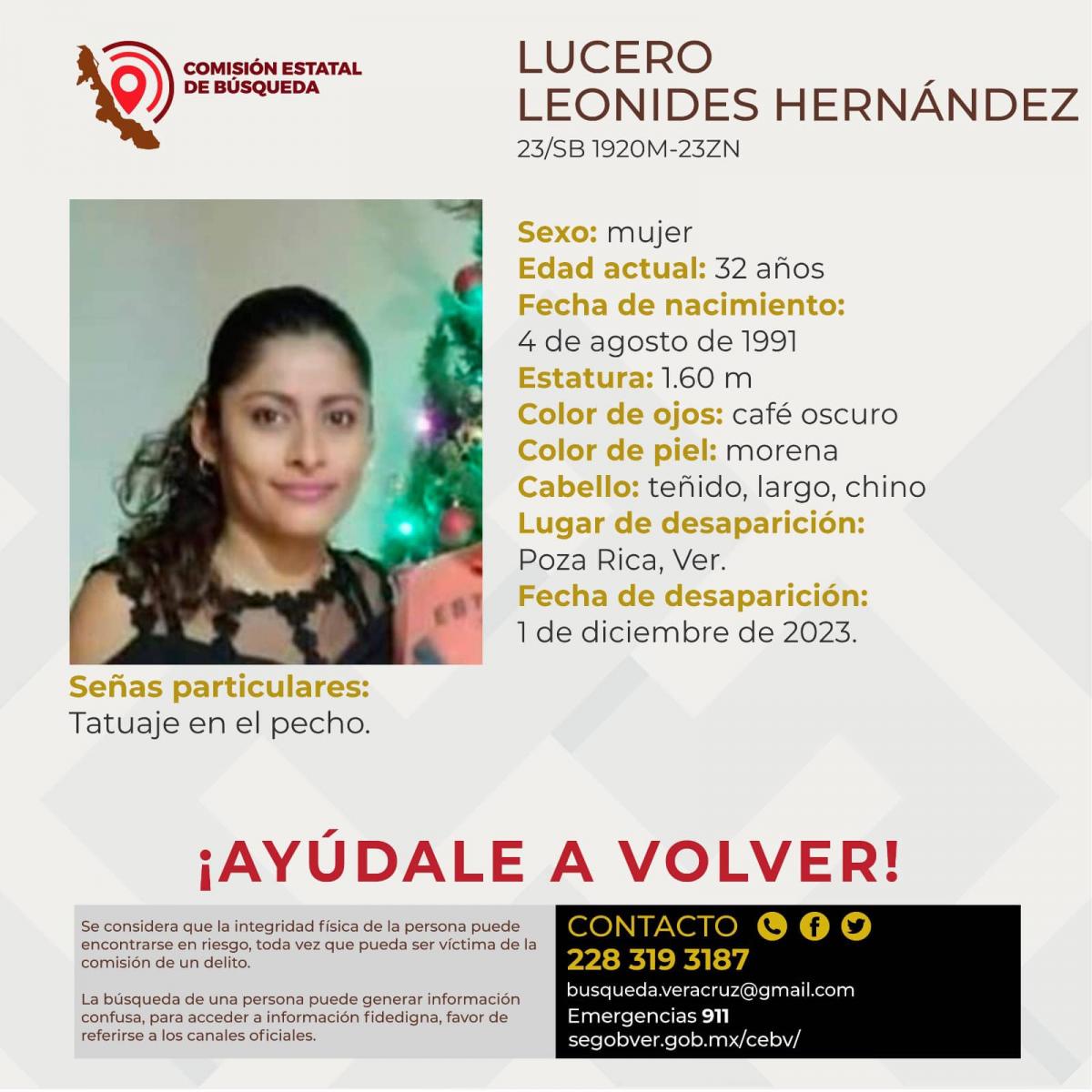 En tanto la ficha de Lucero Leónides Hernández indica que tiene de 32 años, mide 1.60 m, tiene ojos color café oscuro, su color de piel es morena, y su cabello es teñido de forma china, de corte largo. Ella también despareció en el municipio de Poza Rica el pasado viernes 1 de diciembre.