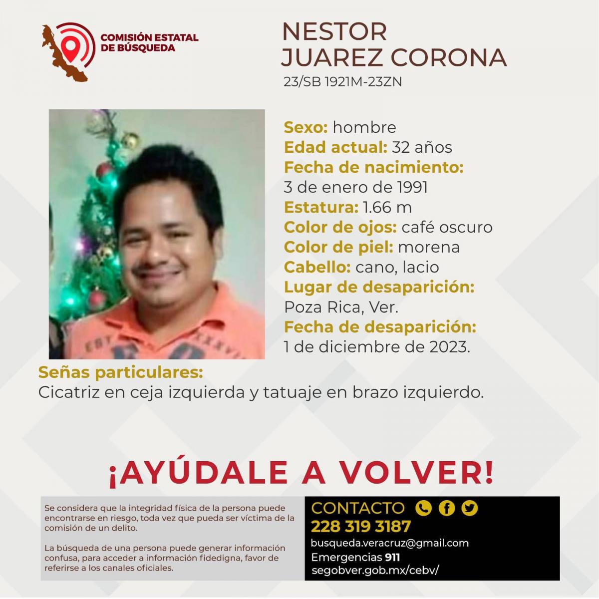 Los mismos familiares desesperados piden ayuda a la población para localizarlos sanos. Se trata de Néstor Juárez Cardona de 32 años, con una estatura de 1.66 metros, color de ojos café oscuro, el color de piel morena, el cabello cano de forma lacio, desaparecido en Poza Rica.