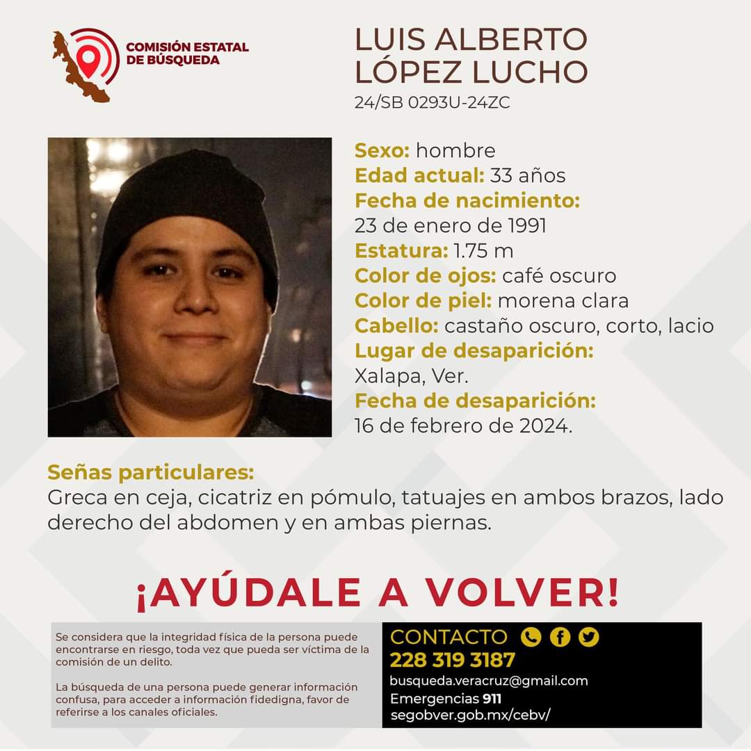 Xalapa, Ver.- Desde el pasado 16 de febrero, Luis Alberto López Lucho desapareció en la ciudad de Xalapa y desde entonces es buscado por amigos y familiares que ya reportaron su desaparición ante la Comisión Estatal de Búsqueda de Personas que ya emitió una ficha con sus señas particulares para solicitar el apoyo de la ciudadanía en su localización.