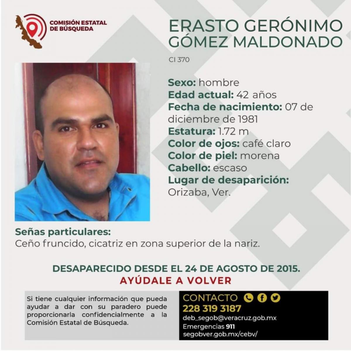 La ficha CI 370 reportó la desaparición de Erasto Gerónimo Gómez Maldonado, de 42 años de quien desapareció en 2015 en Orizaba, Veracruz. Por este hecho sus familiares iniciaron una búsqueda durante varios años.