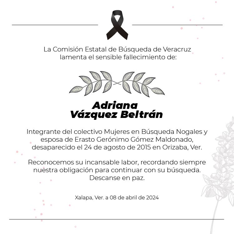 La Comisión Estatal de Búsqueda Veracruz confirmó el fallecimiento de la señora quien era integrante del Colectivo “Mujeres en Búsqueda Nogales”. Ella era esposa de Erasto Gerónimo Gómez Maldonado, desaparecido el 24 de agosto de 2015 en Orizaba.