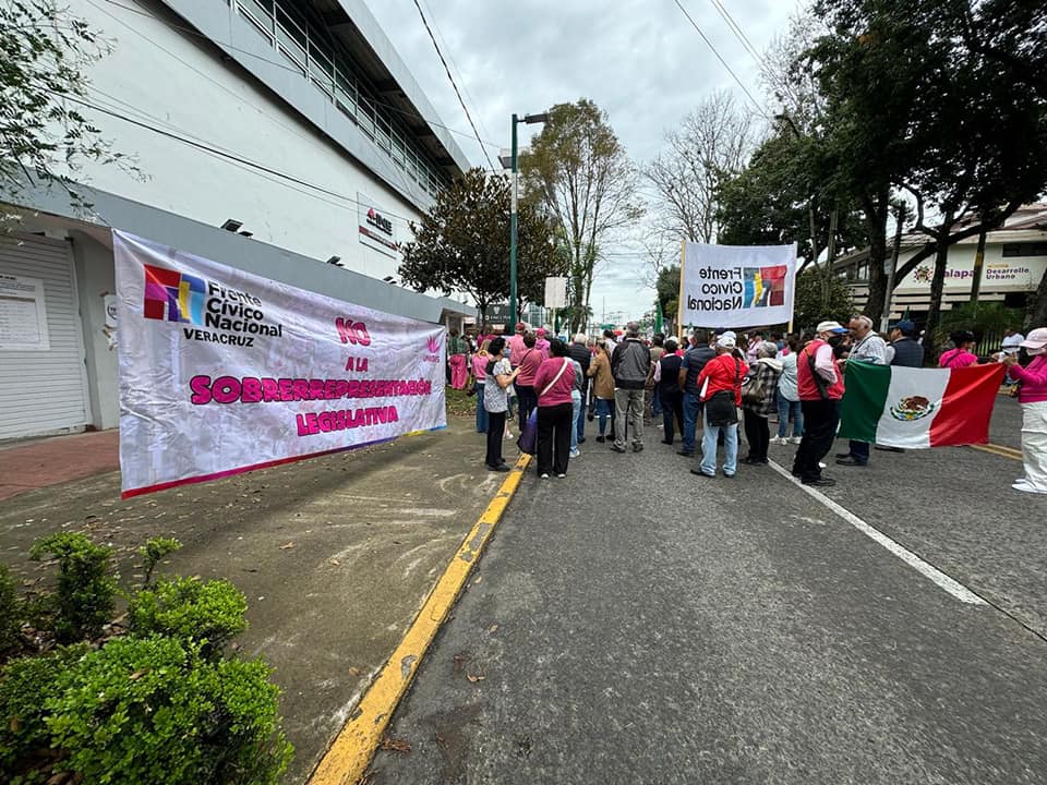 Xalapa, Veracruz.- Integrantes del Frente Cívico Nacional se manifestaron frente a las oficinas del Instituto Nacional Electoral (INE) en Xalapa para exigir la intervención de este organismo en contra de lo que consideran que se convertirá en una sobrerrepresentación de Morena en el Congreso de la Unión
