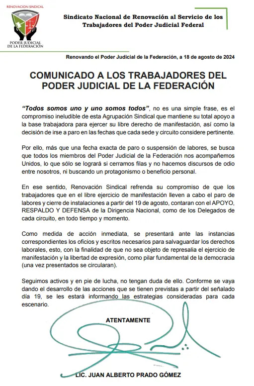 El día de ayer circuló en redes sociales el comunicado del Sindicato Nacional de Renovación al Servicio de los Trabajadores del Poder Judicial, que invitó al paro de labores nacional.