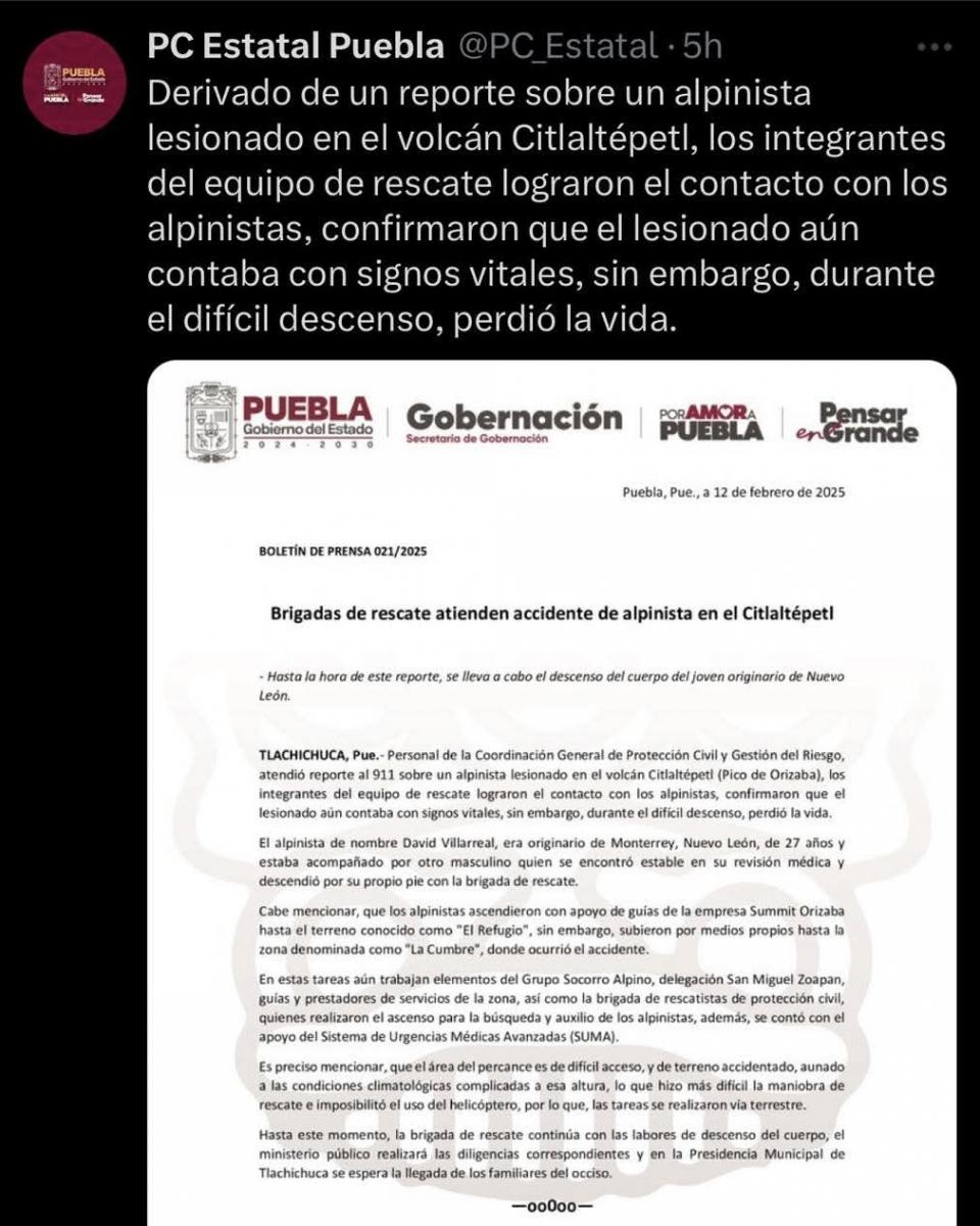 Durante la madrugada del jueves 13 de febrero, brigadistas confirmaron que el cuerpo de David ya había sido descendido. Protección Civil de Puebla informó que el Ministerio Público llevará a cabo las diligencias correspondientes.
