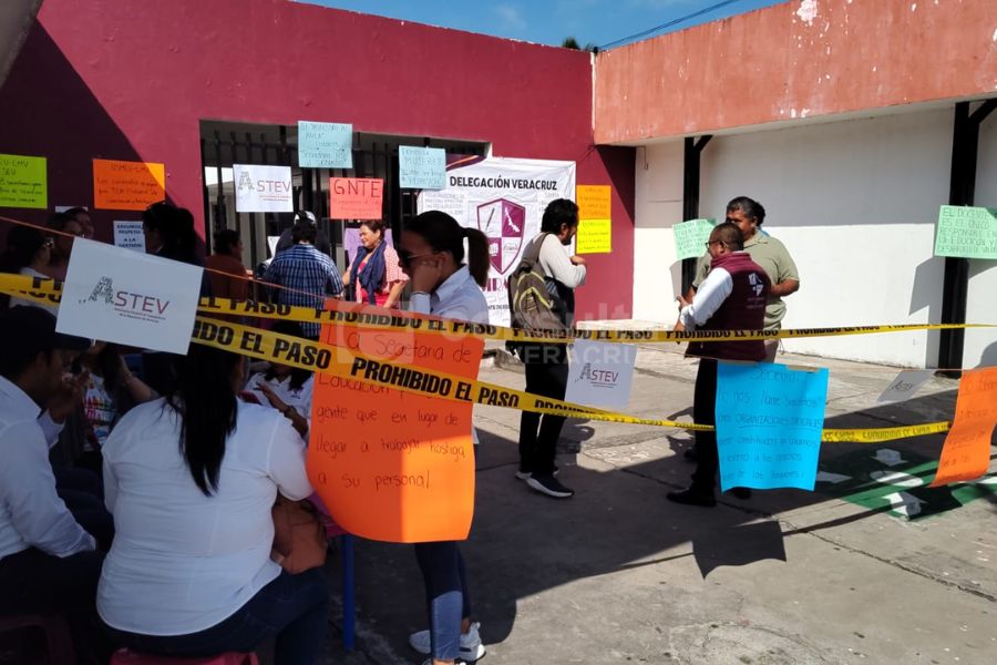 Veracruz, Ver.- Maestros de cuatro sindicatos tomaron las instalaciones de la Secretaría de Educación Delegación (SEV) Veracruz, ubicadas en la avenida Negrete de la colonia Zaragoza, para exigir respeto a sus derechos laborales y un alto al acoso laboral por parte de la institución.