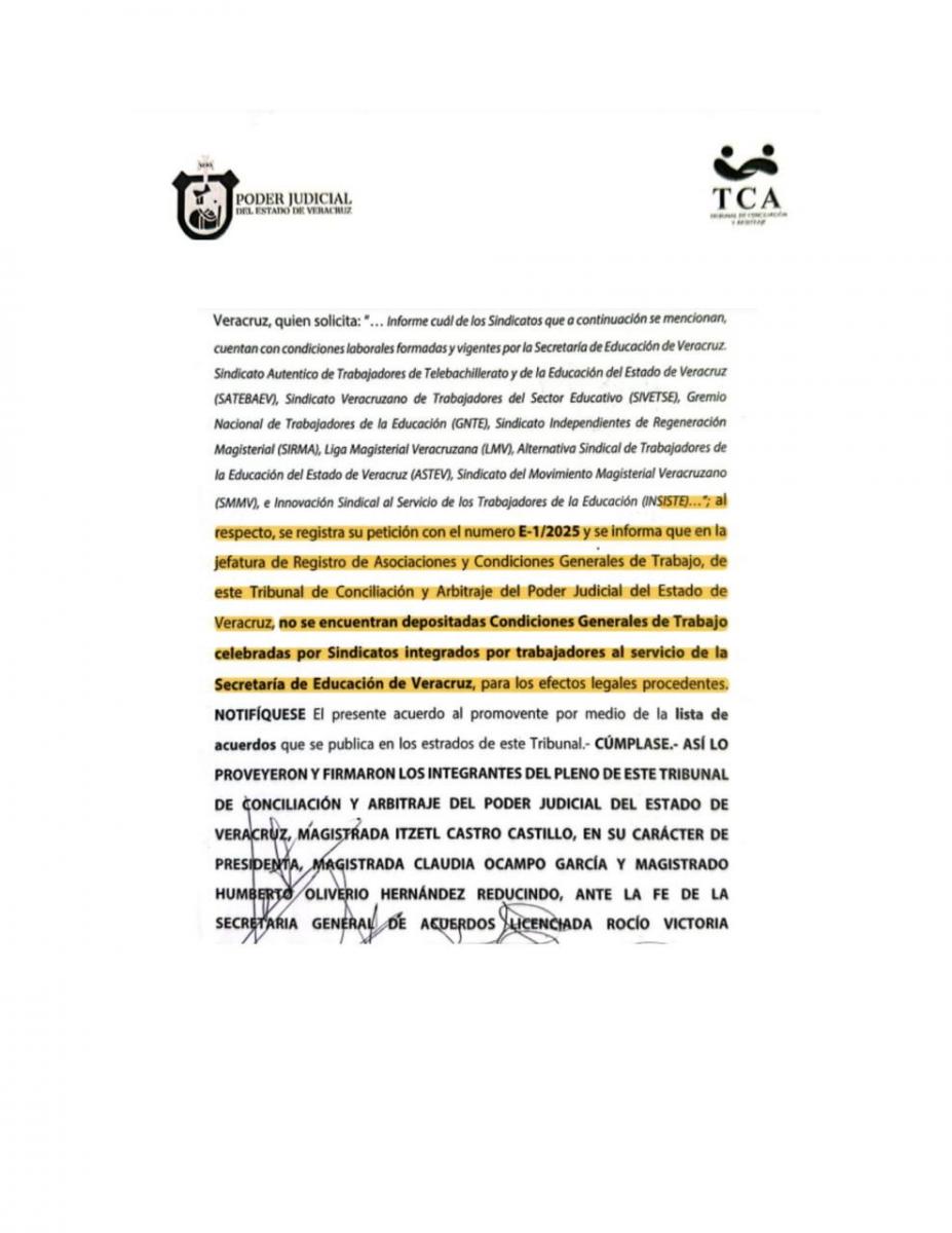 De acuerdo con la magistrada Itzel Castro Castillo, titular del TCA, en la jefatura de Registro de Asociaciones y Condiciones Generales de Trabajo de este Tribunal "no se encuentran depositadas Condiciones Generales de Trabajo" de sindicatos integrados por trabajadores de la SEV, por lo que no existen efectos legales para su movimiento.