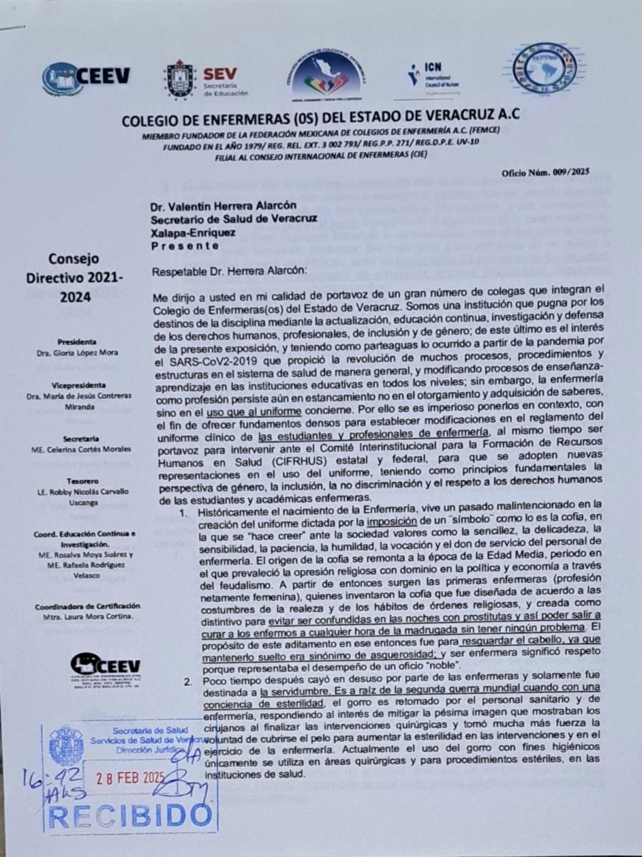 Xalapa, Ver.- El Colegio de Enfermería del Estado de Veracruz (CEEV) presentó una solicitud formal a la Secretaría de Salud estatal para eliminar la obligatoriedad del uso de la cofia en hospitales, centros de salud y escuelas. Esta petición forma parte de un esfuerzo por erradicar la sexualización de la profesión y actualizar la imagen de las enfermeras conforme a los estándares modernos de la práctica médica.