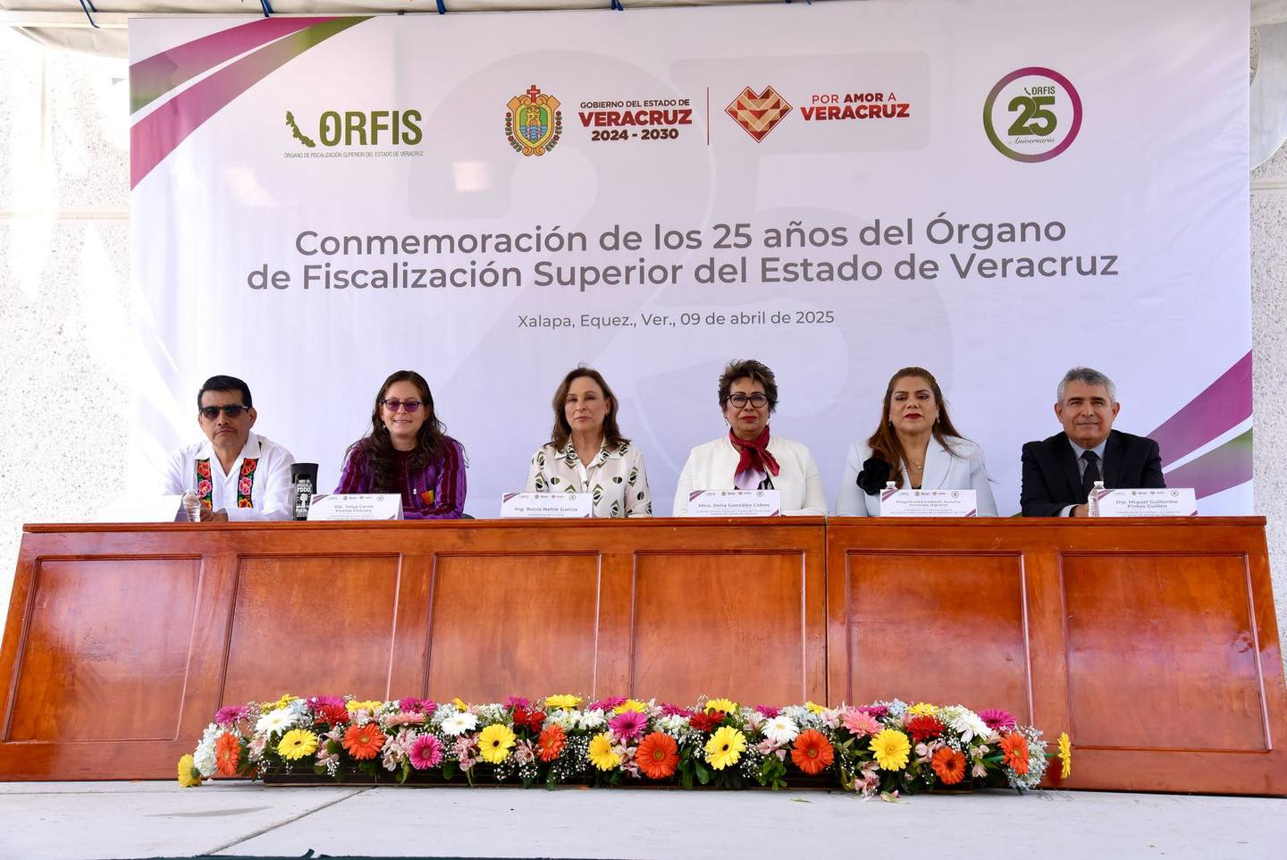 Xalapa, Ver., 09 de abril de 2025.- La LXVII Legislatura del Estado de Veracruz, representada por la presidenta de la Mesa Directiva, diputada Tanya Carola Viveros Cházaro, y por el presidente de la Junta de Coordinación Política (Jucopo), diputado Esteban Bautista Hernández, atestiguó la conmemoración de los 25 años del Órgano de Fiscalización Superior del estado (Orfis).