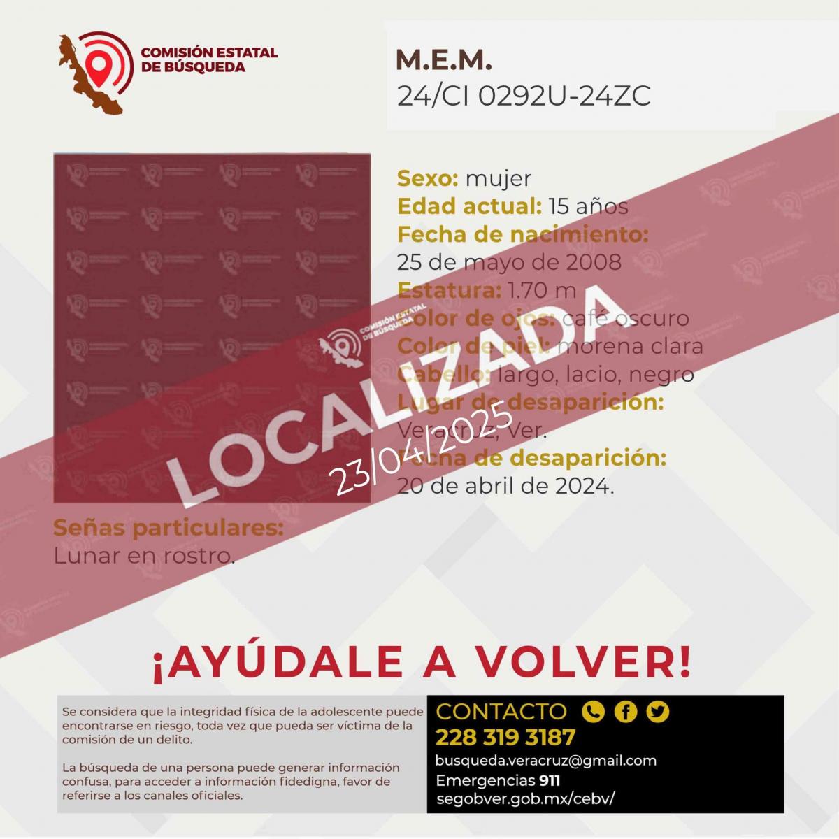 La Comisión Estatal de Búsqueda también confirmó este 28 de abril la localización de M.J.R.D., de 17 años, quien había desaparecido apenas dos días antes, el 26 de abril de 2025, en el municipio de Chocamán, Veracruz.
