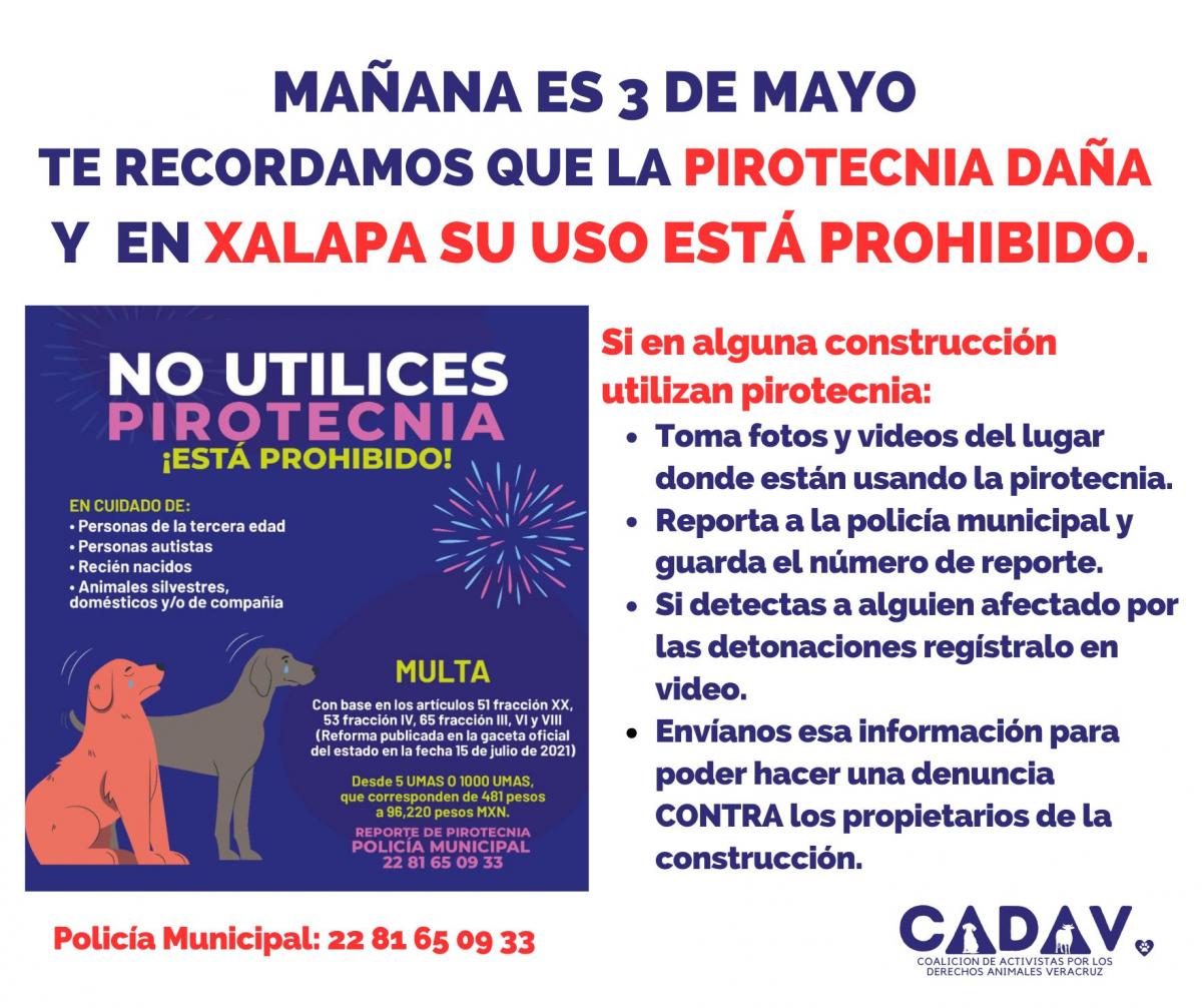 La coordinadora de la coalición animalista, Lourdes Jiménez, indicó que para unos representa una fiesta pero para otros es un tormento, además de que en Xalapa la pirotecnia está prohibida.
