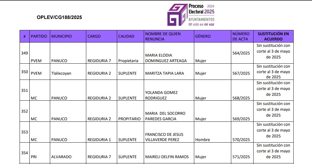 El Organismo Público Local Electoral (OPLE) de Veracruz llevó a cabo la Sesión Urgente del Consejo General la noche del lunes 5 de mayo de este 2025, en la capital veracruzana, para nombrar a quienes sustituirán las candidaturas.