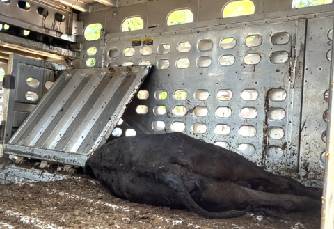 Un becerro que se encontraba en una de las jaulas que transportaba Rogelio Medina ya se encontraba muerto mientras el conductor esperaba en la fila para pasar el filtro. Al menos cinco animales mueren cada semana en la espera, aseguran choferes.
